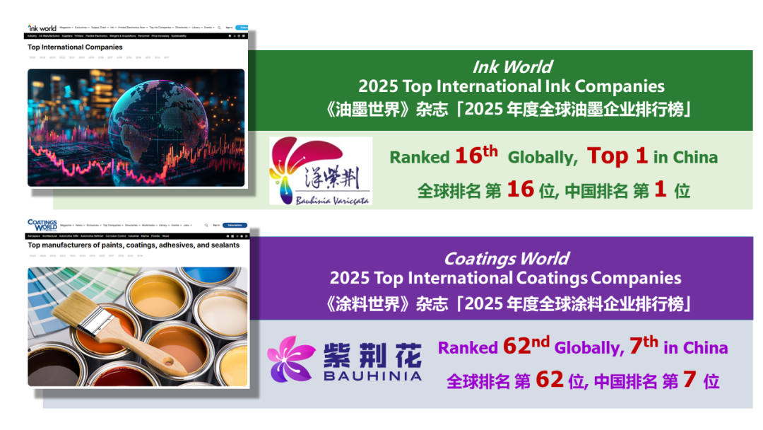 18.2025年8月,「洋紫荊油墨」以2024年度銷售額1.76億美元名列「2025 年度全球油墨企業(yè)排行榜」全球第16位 (比去年上升兩位), 并再度榮登中國第1位