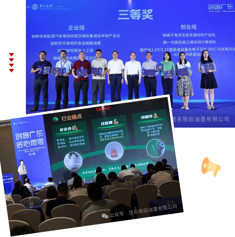 20.2025年9月9日,茂名阪田油墨有限公司“創(chuàng)新性可商用的食品接觸油墨項(xiàng)目"榮獲第九屆“創(chuàng)客廣東”省賽三等獎(jiǎng)。