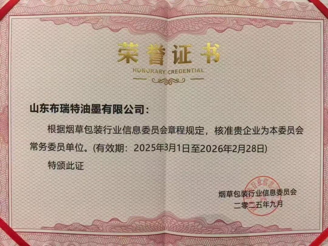 24.2025年9月上旬,山東布瑞特油墨有限公司成功斬獲2024年度煙包供應(yīng)企業(yè) “材料類 質(zhì)量卓越獎(jiǎng)” 。
