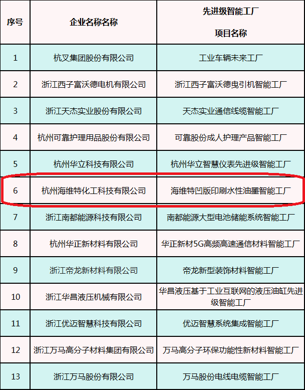 9.2025年5月,浙江省經(jīng)信廳公布浙江省先進(jìn)級智能工廠(第一批)名單,杭州海維特化工科技有限公司的“海維特凹版印刷水性油墨智能工廠"項(xiàng)目成功入選。