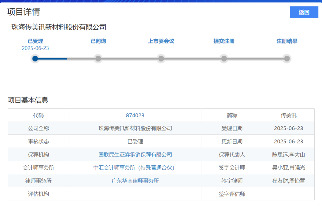 11.2025年6月23日,珠海傳美訊新材料股份有限公司北交所IPO獲受理。