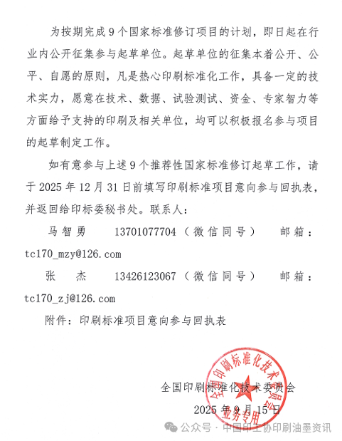起草單位征集本著公開(kāi)、公平、自愿的原則,凡是熱心印刷標(biāo)準(zhǔn)化工作,具備一定的技術(shù)實(shí)力,愿意在技術(shù)、數(shù)據(jù)、試驗(yàn)測(cè)試、資金、專(zhuān)家智力等方面給予支持的有關(guān)企業(yè)或科研機(jī)構(gòu)、院校,均可報(bào)名參與標(biāo)準(zhǔn)起草制定工作。如有參與意向,可咨詢(xún)中國(guó)印工協(xié)印刷油墨分會(huì)或全國(guó)印刷標(biāo)準(zhǔn)化技術(shù)委員會(huì),并于2025年12月31日前填寫(xiě)印刷標(biāo)準(zhǔn)項(xiàng)目意向參與回執(zhí)表,返回至印標(biāo)委秘書(shū)處。