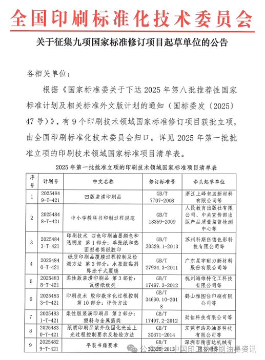 2025年9月15日,全國(guó)印刷標(biāo)準(zhǔn)化技術(shù)委員會(huì)發(fā)布公告,根據(jù)《國(guó)家標(biāo)準(zhǔn)委關(guān)于下達(dá)2025年第八批推薦性國(guó)家標(biāo)準(zhǔn)計(jì)劃及相關(guān)標(biāo)準(zhǔn)外文版計(jì)劃的通知(國(guó)標(biāo)委發(fā)〔2025〕47號(hào))》,有9個(gè)印刷技術(shù)領(lǐng)域國(guó)家標(biāo)準(zhǔn)修訂項(xiàng)目獲批立項(xiàng)。在9個(gè)國(guó)家標(biāo)準(zhǔn)修訂項(xiàng)目中,中國(guó)印工協(xié)印刷油墨分會(huì)有三家會(huì)員單位牽頭起草修訂工作,分別是蘇州科斯伍德色彩科技有限公司、杭州海維特化工科技有限公司和東莞市浩彩油墨科技有限公司,需要修訂的三項(xiàng)國(guó)家標(biāo)準(zhǔn)均是十年前制定,經(jīng)復(fù)審后有的標(biāo)準(zhǔn)可能因技術(shù)內(nèi)容落后、指標(biāo)缺失或?qū)嵤┠晗捱^(guò)長(zhǎng)等原因,需要及時(shí)更新或補(bǔ)充完善。國(guó)家標(biāo)準(zhǔn)修訂有助于提升產(chǎn)品質(zhì)量,滿(mǎn)足市場(chǎng)需求,進(jìn)而提升行業(yè)競(jìng)爭(zhēng)力。