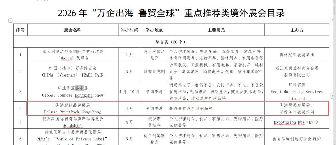 廣東省商務廳率先在《2026年“粵貿(mào)全球”廣東商品境外展覽平臺清單》中將其列為官方認證項目;與此同時,山東省商務廳《2026年“萬企出海 魯貿(mào)全球”重點推薦類境外展會目錄》中,也明確將其展會體系中的高端組成部分——香港奢侈品包裝展——納入重點推薦之列。