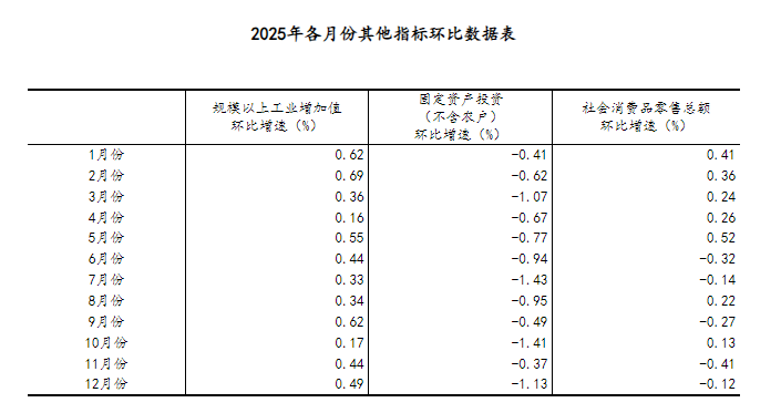 (2)根據(jù)季節(jié)調(diào)整模型自動(dòng)修正結(jié)果,對(duì)近一年來(lái)各期國(guó)內(nèi)生產(chǎn)總值、規(guī)模以上工業(yè)增加值、固定資產(chǎn)投資(不含農(nóng)戶)、社會(huì)消費(fèi)品零售總額環(huán)比增速進(jìn)行修訂。修訂結(jié)果及2025年四季度GDP環(huán)比數(shù)據(jù)、2025年12月份其他指標(biāo)環(huán)比數(shù)據(jù)如下: