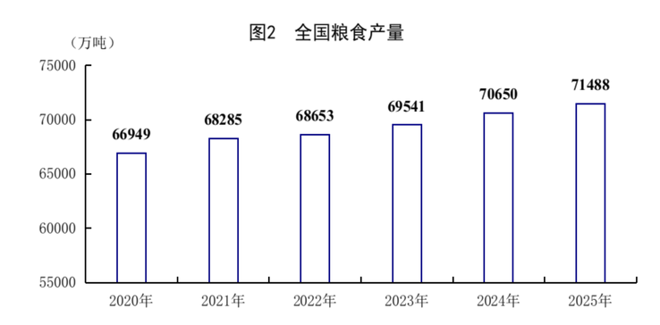 全年全國(guó)糧食總產(chǎn)量71488萬(wàn)噸,比上年增加838萬(wàn)噸,增長(zhǎng)1.2%。其中,夏糧產(chǎn)量14975萬(wàn)噸,下降0.1%;早稻產(chǎn)量2851萬(wàn)噸,增長(zhǎng)1.2%;秋糧產(chǎn)量53662萬(wàn)噸,增長(zhǎng)1.5%。分品種看,小麥產(chǎn)量14007萬(wàn)噸,基本持平;玉米產(chǎn)量30124萬(wàn)噸,增長(zhǎng)2.1%;稻谷產(chǎn)量20904萬(wàn)噸,增長(zhǎng)0.7%;大豆產(chǎn)量2091萬(wàn)噸,增長(zhǎng)1.3%。全年豬牛羊禽肉產(chǎn)量10072萬(wàn)噸,比上年增長(zhǎng)4.2%,首次超過(guò)1億噸。其中,豬肉產(chǎn)量5938萬(wàn)噸,增長(zhǎng)4.1%;牛肉產(chǎn)量801萬(wàn)噸,增長(zhǎng)2.8%;羊肉產(chǎn)量496萬(wàn)噸,下降4.2%;禽肉產(chǎn)量2837萬(wàn)噸,增長(zhǎng)6.7%。牛奶產(chǎn)量4091萬(wàn)噸,增長(zhǎng)0.3%;禽蛋產(chǎn)量3498萬(wàn)噸,下降2.5%。全年生豬出欄71973萬(wàn)頭,增長(zhǎng)2.4%;年末生豬存欄42967萬(wàn)頭,增長(zhǎng)0.5%。