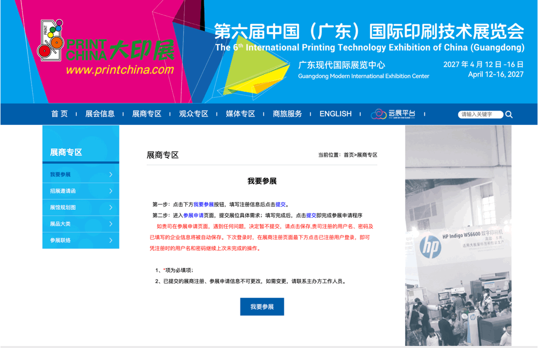 登錄展會(huì)官方網(wǎng)站www.printchina.com首頁,點(diǎn)擊導(dǎo)航欄“展商專區(qū)”--“我要參展”按鈕,進(jìn)行申報(bào);
