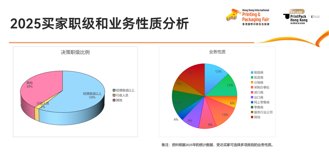 這一動(dòng)向背后,折射出香港印包展在行業(yè)中的獨(dú)特定位:它并非傳統(tǒng)意義上的設(shè)備與耗材交易平臺(tái),而是一個(gè)印刷包裝服務(wù)供應(yīng)商與終端用戶直接對(duì)接的商貿(mào)樞紐。在多數(shù)印刷包裝類展會(huì)中,參展商以設(shè)備制造商、耗材供應(yīng)商為主,臺(tái)下買家多為印刷廠、包裝廠;而香港印包展的參展主體是印刷服務(wù)商、包裝解決方案提供商、創(chuàng)新材料企業(yè),到場(chǎng)采購(gòu)的則是來(lái)自全球制造業(yè)、消費(fèi)品、日化、食品、酒類、醫(yī)藥等行業(yè)的終端用戶。這一結(jié)構(gòu)差異,決定了參展企業(yè)在這里觸達(dá)的是“真正的買家”——那些直接為產(chǎn)品采購(gòu)印刷包裝服務(wù)的企業(yè)決策者。