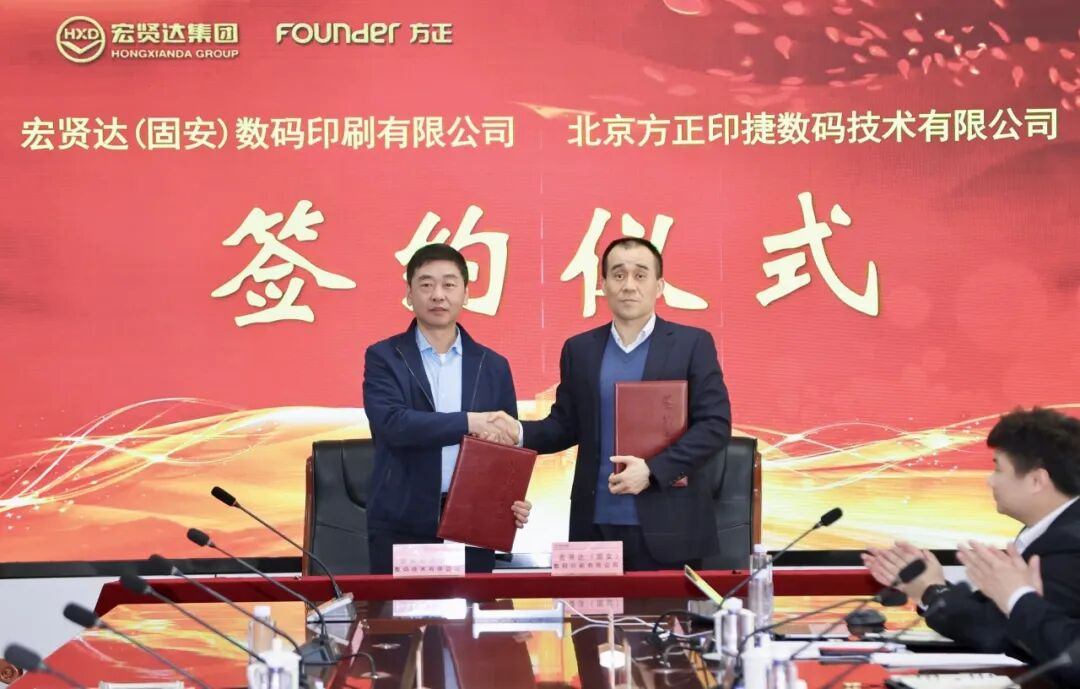 方正電子CEO、方正印捷董事長鄭偉,宏賢達集團董事長、總裁張俊賢及雙方代表出席儀式。
