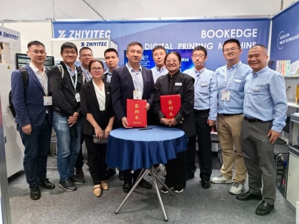 德魯巴印刷展開展次日北京至一在展會(huì)現(xiàn)場(chǎng)與Leo Paper Group利奧紙品印刷集團(tuán)鶴山雅圖仕印刷有限公司舉行三臺(tái)書口美學(xué)印刷機(jī)的簽約儀式