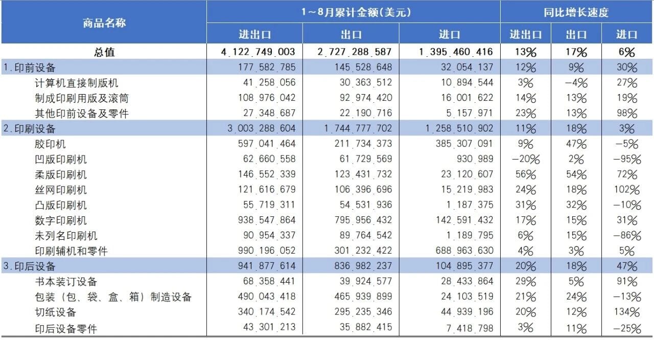2025年1~8月國內(nèi)三大類印刷相關(guān)商品進(jìn)出口總體運(yùn)行概況如下: