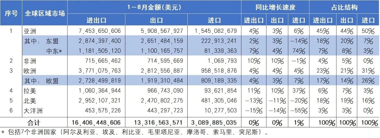 04/ 從進(jìn)出口市場分布動(dòng)態(tài)看,出口商品,對(duì)亞洲、歐洲、拉美、非洲市場出口保持增長,對(duì)北美、大洋洲市場出口持續(xù)下滑;進(jìn)口商品,從亞洲、歐洲、拉美進(jìn)口保持增長,從北美、大洋洲、非洲市場進(jìn)口維持下降