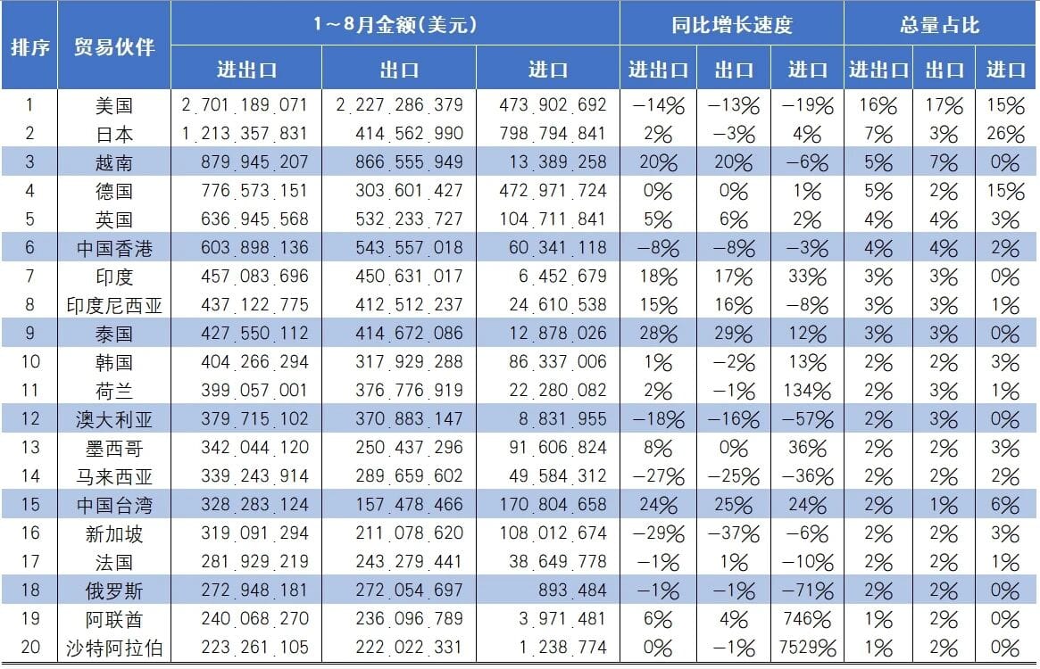 05/ 從主要進(jìn)出口貿(mào)易伙伴交易額變化看,除對(duì)美國出口處同比下降狀態(tài)外,居出口前五位的其他貿(mào)易伙伴維持增長;進(jìn)口前五位的貿(mào)易伙伴,從美國和新加坡進(jìn)口持續(xù)下降,其余貿(mào)易伙伴進(jìn)口保持同比增長