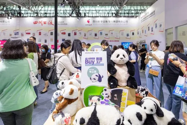 大熊貓人見人愛,凡跟大熊貓相關(guān)的事物,想不受歡迎都難。四川19家出版單位以“書寫四川出版輝煌篇章 綻放巴蜀文化時代光彩”為主題,整體亮相山東國際會展中心5號館。四川出版展區(qū)直接將出圈的實(shí)體書店——“熊貓書店”,搬到了書博會中——打造面積65平米的熊貓書店主題區(qū),精心準(zhǔn)備熊貓玩偶、熊貓冰箱貼、熊貓徽章、熊貓擺件、熊貓包包、熊貓水杯、熊貓小冊子等200余品種熊貓主題文創(chuàng),為參訪讀者和“熊貓控”觀眾帶來一場熊貓主題盛宴,現(xiàn)場受到觀眾追捧,打卡的人潮絡(luò)繹不絕。