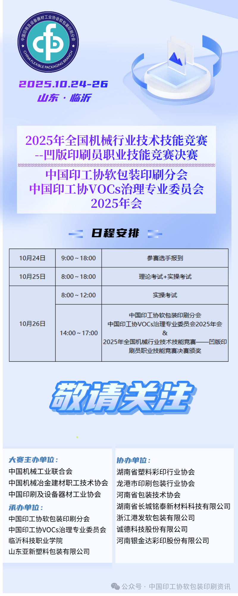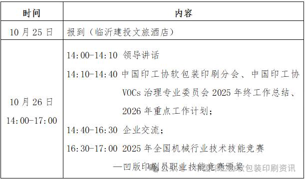 中國(guó)印刷及設(shè)備器材工業(yè)協(xié)會(huì)軟包裝印刷分會(huì)、中國(guó)印刷及設(shè)備器材工業(yè)協(xié)會(huì)VOCs治理專業(yè)委員會(huì)(以下簡(jiǎn)稱:中國(guó)印工協(xié)軟包裝印刷分會(huì)、中國(guó)印工協(xié)VOCs治理專業(yè)委員會(huì)) 定于2025 年10月26日在山東臨沂召開年會(huì),總結(jié)2025年工作內(nèi)容,部署2026年重點(diǎn)工作計(jì)劃,同期還將舉辦“2025年全國(guó)機(jī)械行業(yè)技術(shù)技能競(jìng)賽——凹版印刷員職業(yè)技能競(jìng)賽決賽”?,F(xiàn)將具體事項(xiàng)通知如下: